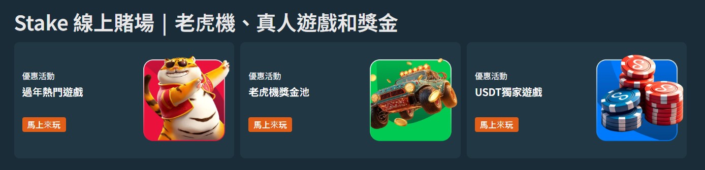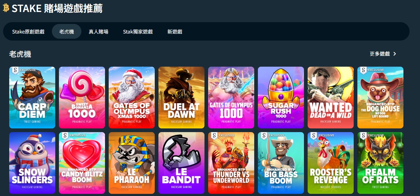 Stake 娛樂城提供各式各樣的賭場遊戲,從經典的桌上遊戲到創新的電子遊戲一應俱全。玩家可以享受如二十一點、輪盤、骰寶等傳統賭場遊戲,體驗真實的賭場氛圍。此外,平台還提供多種老虎機遊戲,包括經典老虎機、視頻老虎機和大獎老虎機等,讓玩家在旋轉中尋找驚喜。