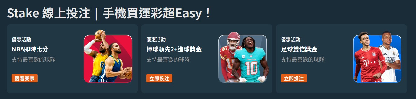 在大型賽事期間,Stake 提供專屬的加碼優惠,如雙倍獎金、任務成就抽獎等。